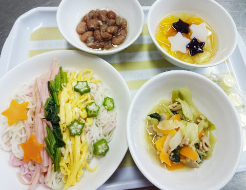 管理栄養士・栄養士が季節の食材を取り入れ、野菜をたっぷり使ったバランスの取れた献立を作成しています。栄養面だけでなく、視覚や嗅覚などの五感を刺激するような献立となるように日々努力しています。